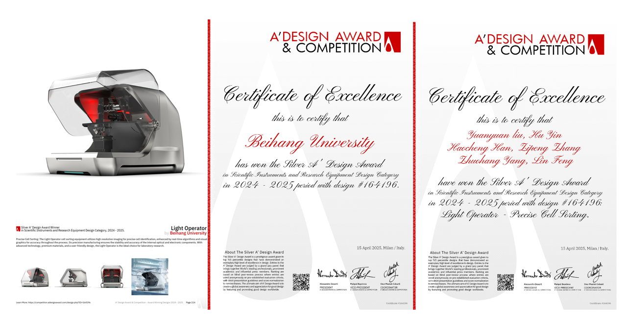 北航新闻网5月13日电(通讯员 王丹)近日,国际著名设计创新比赛——2025年度意大利A’Design Award and Competition设计奖揭晓,北航机械工程及自动化学院跨学科团队(工业设计系教师刘源源、尹虎;仿生微纳制造研究所教师冯林;23级研究生韩浩铖;19级本科生张子鹏、杨卓航;22级本科生李昌根)凭借创新作品《Optical Sorting——光电镊细胞操作平台》荣获金奖(Top 1%),《Light Operator——光电镊细胞操作平台》荣获银奖(Top 3~5%)。