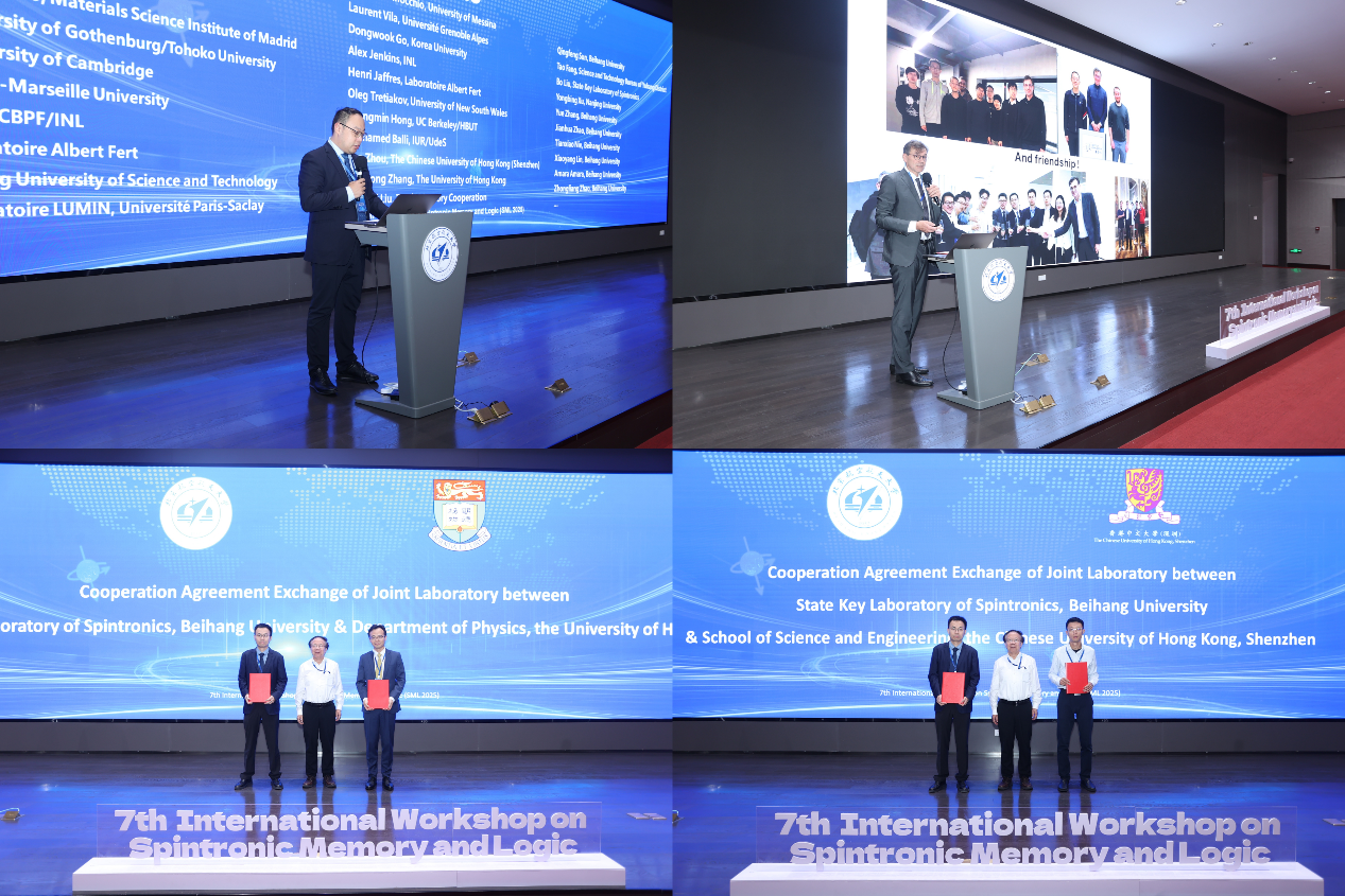 开幕仪式由张悦教授、Stephane Mangin教授和林晓阳教授共同主持。开幕仪式首先以一段暖场视频介绍了北航自旋电子研究团队,回顾了团队成立以来的发展历程和相关成果,展示了举办地点杭州的自然风光与人文背景,介绍了杭州北航国际创新研究院(学院)与北航集成电路科学与工程学院的发展理念与发展优势。接下来,张悦回顾了北航与国际各地的长期合作,着重介绍了杭州北航国际创新研究院(学院)的定位和发展,并对未来更广泛的国际合作与交流表达了美好希冀。Stephane Mangin热烈欢迎了到场的各位国内外参会人员,表达了对北航联合培养研究生的高度认可,并对本次大会的组织者表示了衷心感谢。林晓阳介绍了自旋芯片与技术全国重点实验室的建设情况和未来规划,并与香港大学物理学院、香港中文大学(深圳)理工学院签订了联合实验室合作协议。