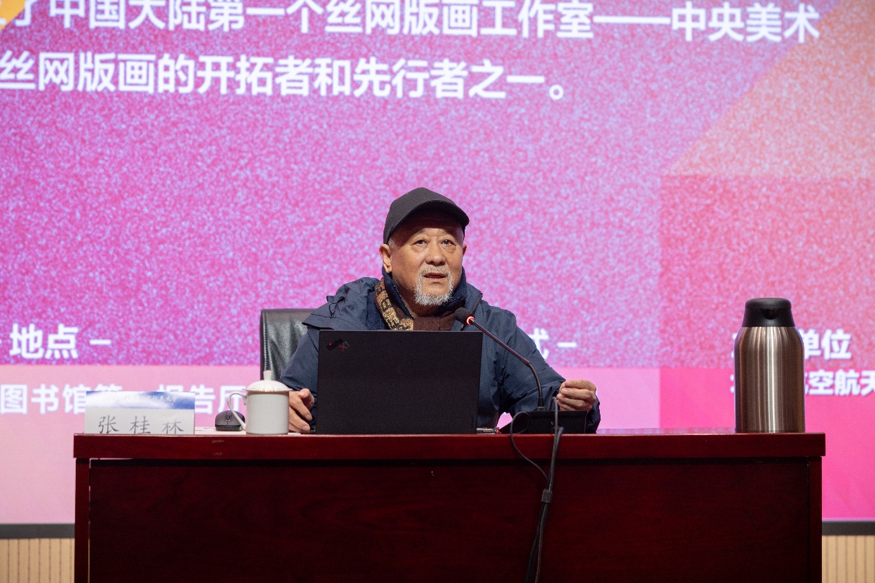 北航新闻网10月24日电(通讯员 高蕊)为庆祝北航建校73周年暨沙河校区艺术馆开馆,10月22日下午,北航美育中心特邀中国现代丝网版画的开拓者和先行者之一、原中央美术学院版画系教授、版画系第一工作室主任张桂林做客美育大讲堂,为师生带来开馆系列活动的第二场美育主题讲座“中国丝网版画发展与探索”。讲座由北航美育中心副主任宋泽惠主持。