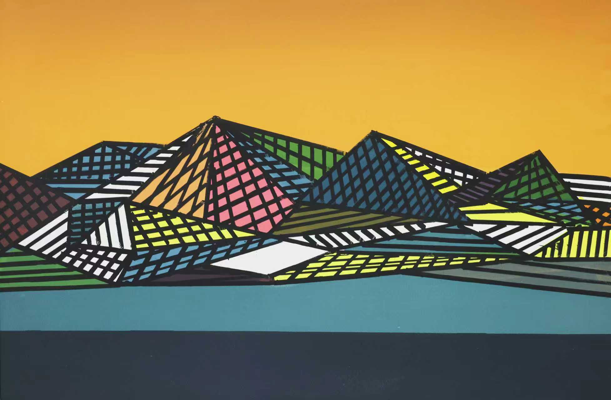 此幅作品与艺术家以往风格有所不同,采用抽象、装饰性手法展现祖国山水风貌。用概括方法表现山水是一种新尝试,色彩上运用设计色彩省去更多细节,呈现艺术家心中的祖国山水。