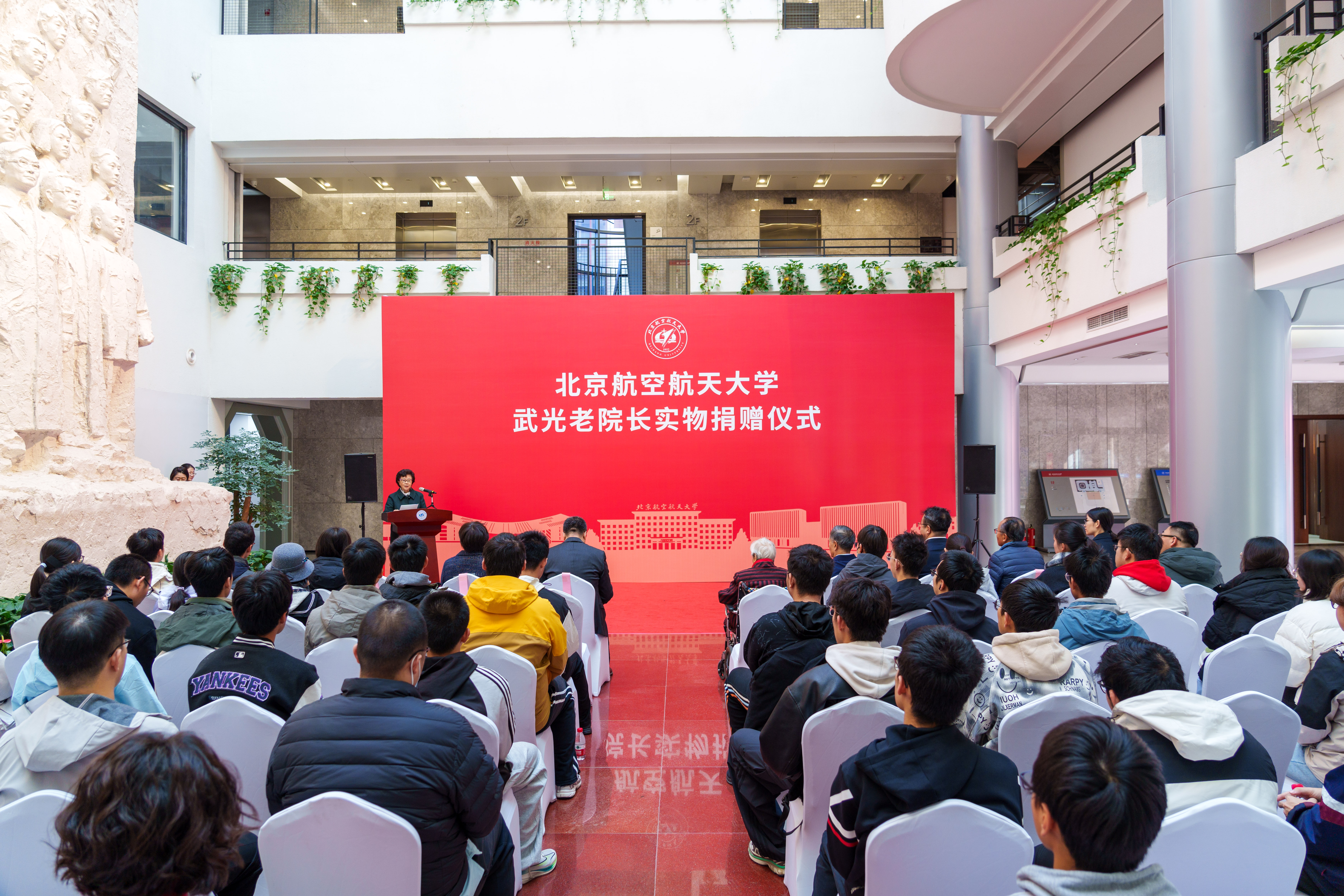 支媛媛介绍了本次捐赠活动的背景,武光老院长作为北航的首任院长,带领广大北航师生,创业兴学,与国同行。今年恰逢老院长辞世十周年,73周年校庆期间,在雕刻有武光老院长主持推进的新中国第一架轻型旅客机“北京一号”的浮雕墙前举办捐赠仪式,既是对老院长的怀念,也可以更好的勉励广大学生向老院长学习,传承以“空天报国”为内核的北航精神!