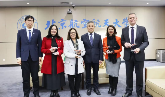 丹妮斯·卡瓦略在致辞中表示,能够到访北航并见证中巴合作历程中的又一重要时刻,她深感荣幸。巴西高等教育人员促进会与北航同年创立,也预示着双方未来在科研探索与教育发展的紧密合作。她高度评价北航对巴西“三位一体”合作布局,期望北航与巴西的合作平台成为中巴科研协同创新的引擎,结出更多丰硕的实质性成果。她强调,拓展中巴两国之间的全方位合作,是双方基于共同利益与长远发展达成的战略共识。2026年是“中巴文化年”,巴西将以此为契机,进一步加深对华人文交流力度,深化双方在航空航天、人工智能等前沿科技领域合作,积极推动两国师生间的双向交流与互动。她坚信,通过不断加强高校及科研机构之间的务实合作,中巴两国在人文、科技、教育等领域的协同发展必将迈上新的台阶。