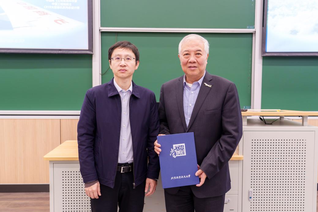 北航新闻网12月15日电(通讯员 宫凡 徐梓恒/文 张智博/摄影)12月10日下午,我国民用飞机设计领域的领军人物,中国工程院院士、国家重大专项C919大型客机系列总设计师、中国商用飞机有限责任公司副总经理吴光辉应邀做客北航大讲堂暨《未来空天技术导论》课程,为200余名北航师生带来一场题为《大飞机与低空经济发展机遇与挑战》的专题报告。北航副校长吴江浩为吴光辉颁发北航大讲堂荣誉证书,中国商用飞机有限公司、北航航空科学与工程学院及沈元学院相关负责人出席活动。