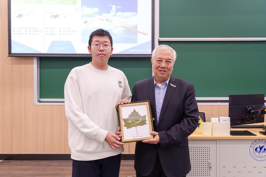 课程结束后,同学们向吴光辉赠送了精心准备的叶雕,其上有在空中翱翔的C919与空警2000,巧妙地构成了“鲲鹏”的意象,预示着我国低空经济正迎来前所未有的发展机遇,如同大鹏乘风,蓄势待发。
