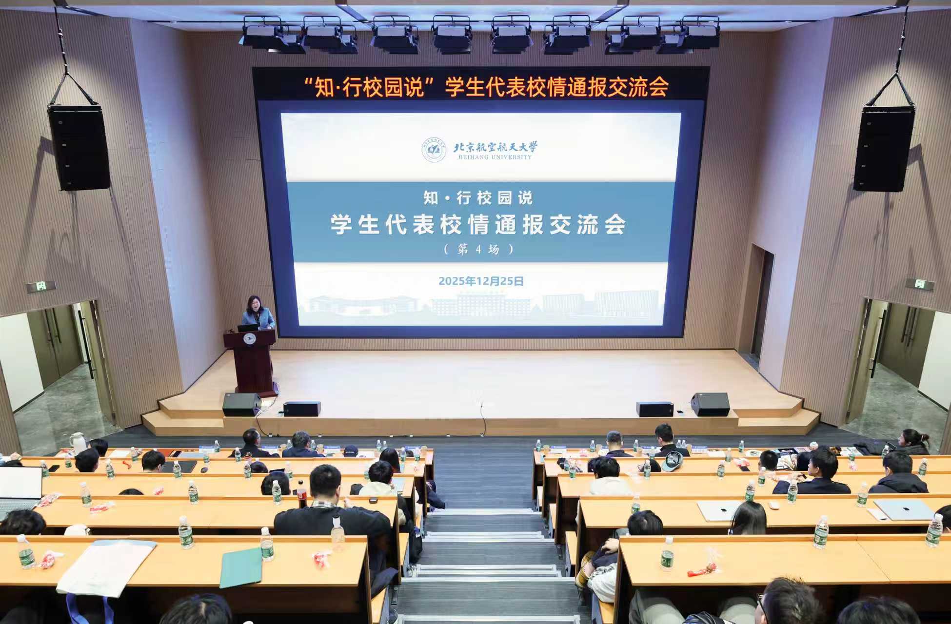 北航新闻网12月27日电(通讯员 郭晶晶/文 刘浩/摄影) 12月25日下午,北京航空航天大学第四场“知·行校园说”学生代表校情通报交流会在沙河校区图书馆第一报告厅举行。副校长邓怡出席会议,学校相关职能部门负责人、校学生会代表、校研究生会代表及各学院学生代表共90余人参会。