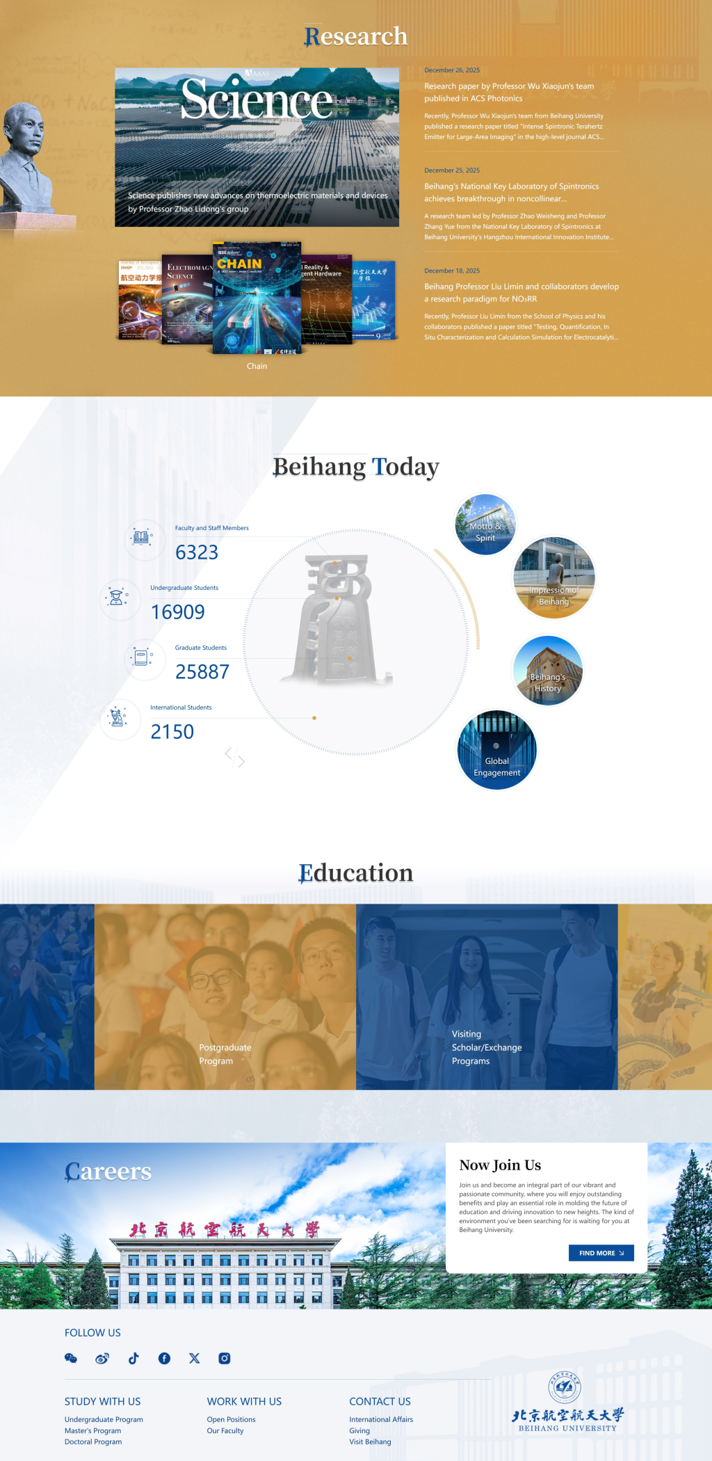 内容上,新版官网以用户需求为中心,设置了“About(关于北航)”、“News(新闻动态)”、“Schools & Colleges(学院设置)”、“Admissions(招生信息)”、“Careers(人才招聘)”、“Research(科学研究)”、“Global(国际合作)”及“Campus(校园生活)”8个一级栏目,下设90余个二、三级页面,体系清晰,覆盖全面。一级栏目均设有综合引导页,帮助用户快速定位所需信息。
