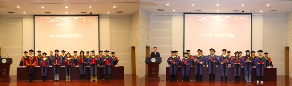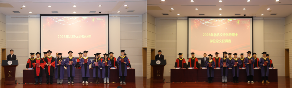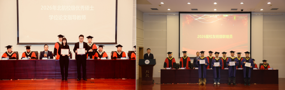 典礼在庄严的国歌声中拉开序幕。荣誉表彰环节,学院党委书记郑海涛宣读北京市优秀毕业生名单;副院长单伟宣读北航优秀毕业生名单;姚忠教授宣读校级优秀硕士论文获得者名单;谭小芬教授宣读校级优秀硕士论文指导教师名单;周荣刚教授宣读2026届校友班级联络员名单。在热烈的掌声中,受表彰的师生依次上台,接过象征荣誉的证书,将这值得铭记的时刻收入镜头。每一次定格,皆是求学路上熠熠生辉的勋章,为青春岁月镌刻下浓墨重彩的印记。