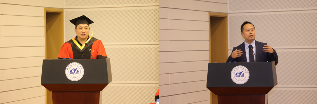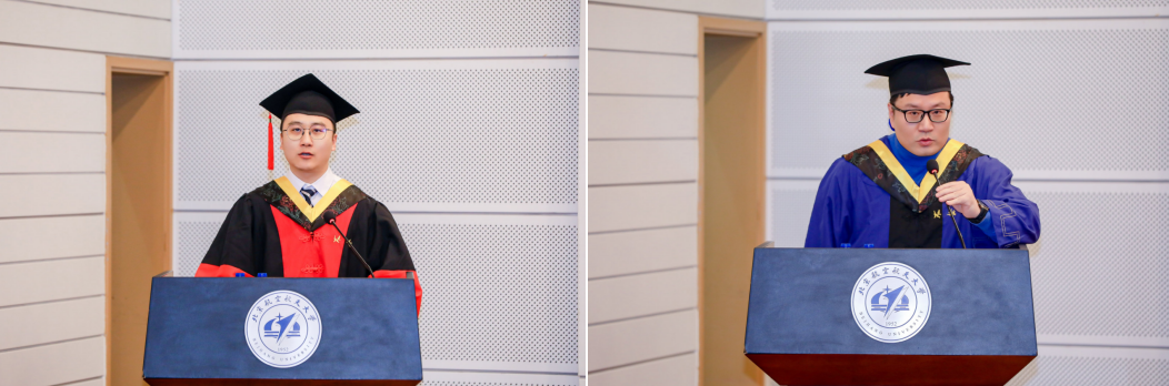 随后,全日制毕业生代表徐璞、非全日制毕业生代表牛欣荟分别发言。他们深情感谢学院搭建的科研发展平台与导师的悉心培养,结合在科研求学、“一案两实”及多元活动中的成长感悟,坚定表示将秉承北航人务实笃行的精神血脉,以实际行动践行使命担当,为社会发展贡献力量,为母校续写荣光。