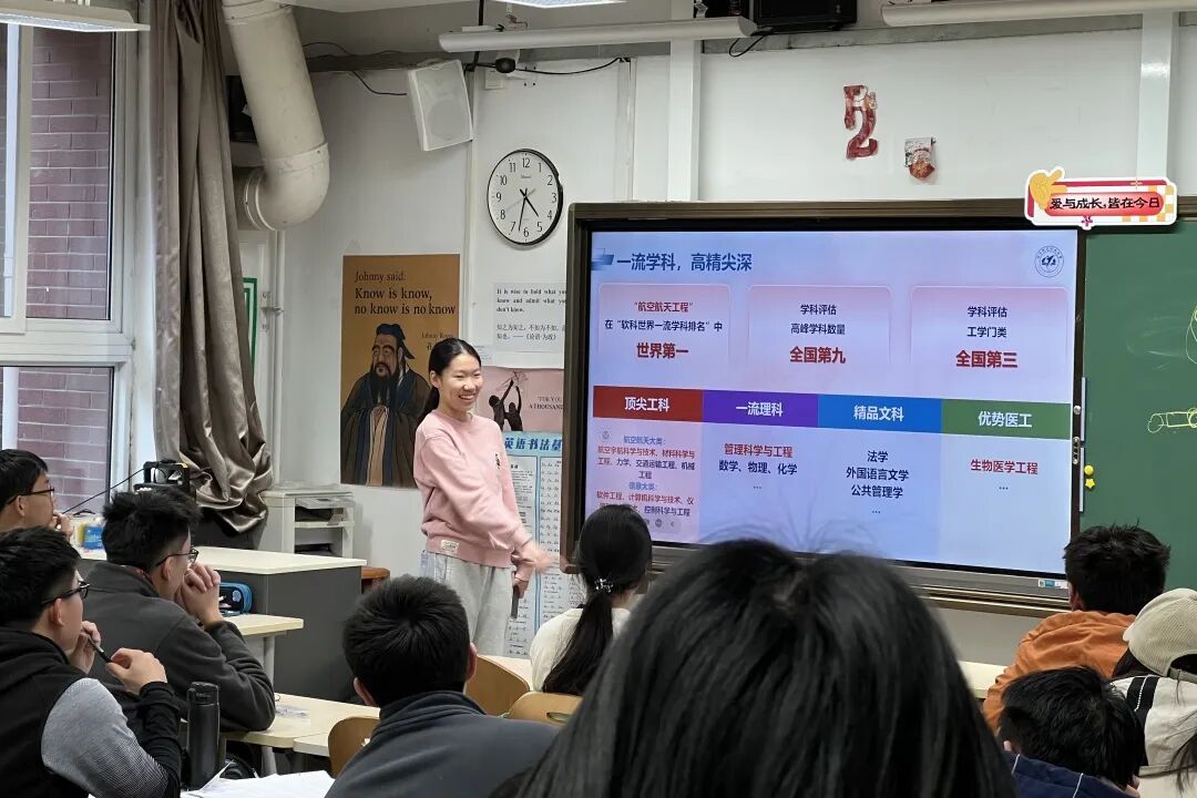 传源书院航声筑梦实践队走进北京市十一学校开展主题宣讲,分享北航丰富的校园生活与传源书院的特色育人理念,为高三学子备考蓄力、加油鼓劲,以亲身经历答疑解惑,助力学子明晰方向,共筑梦想航向。