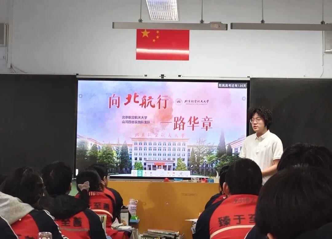 中法航空学院闫霖同学跟随“山河四省”实践队走进河北张家口,先后在启臻学校与宣化第四中学开启两场“北航之约”宣讲课,详细介绍了北航的校园资讯和招生政策,并分享备战高考的经验,将空天梦想的种子播撒进燕赵学子的心田。