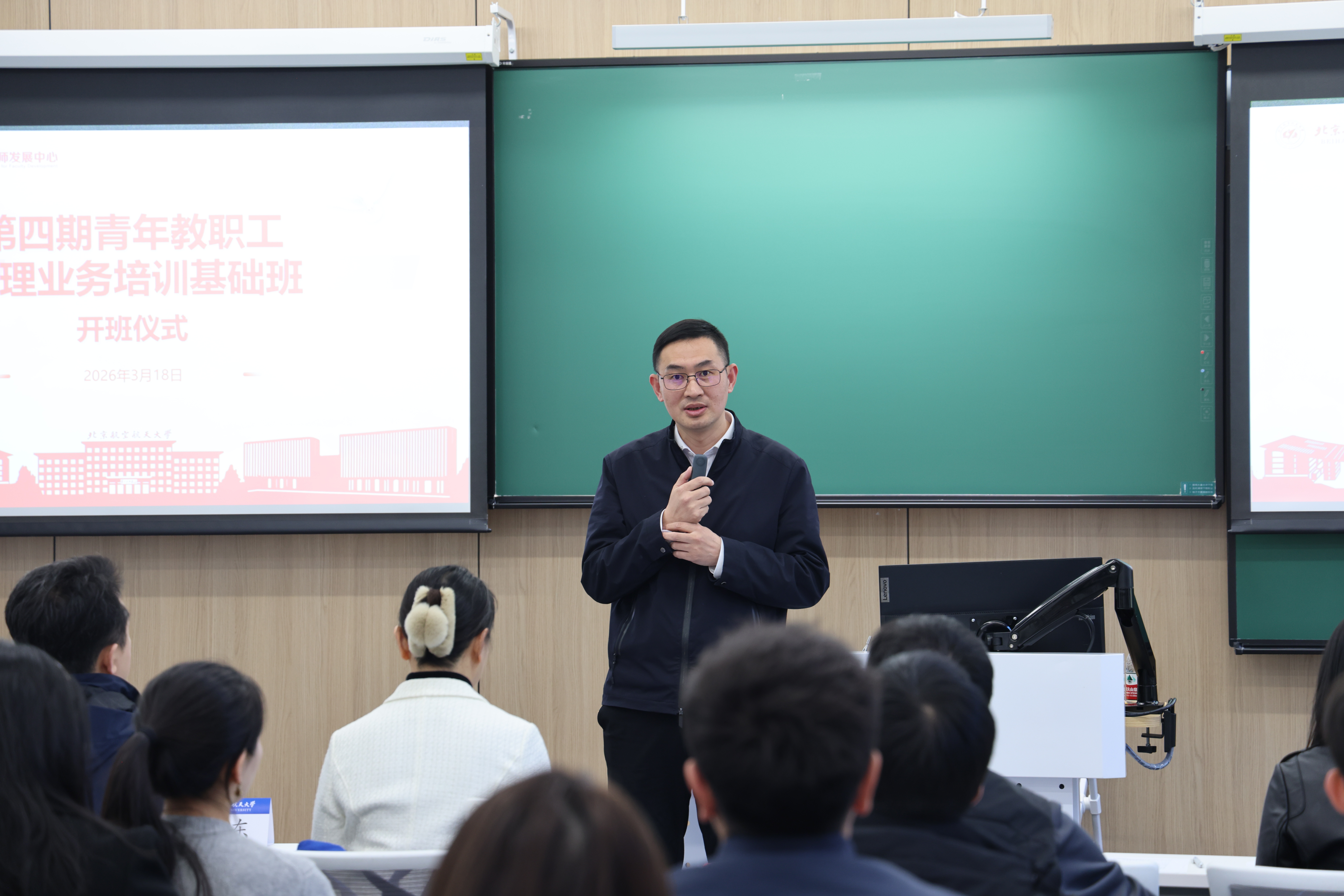 北航新闻网3月20日电(通讯员 王孚尹/文 王旭 龚德艳 王思玉/摄影)3月18日下午,由机关党委、教师发展中心联合组织的第四期青年教职工管理业务培训基础班开班仪式在学院路校区老主楼主321教室举行,杭州国际校园同步进行。校党委副书记程波出席仪式并致辞,机关党委、党委宣传部、教师发展中心、杭州国际创新学院负责人以及京、杭两地60余位青年教职工参加。开班仪式由教师发展中心主任李红捷主持。