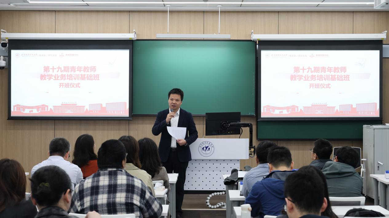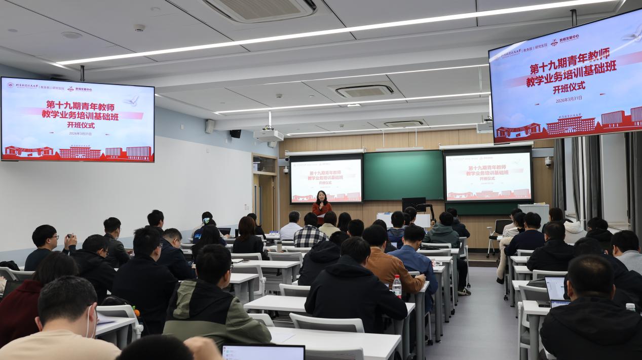 北航新闻网4月2日电(通讯员 楼丝迪/文 王旭 薛晴冉 王思玉 楼丝迪/摄影)3月31日上午,学校第十九期青年教师教学业务培训基础班开班仪式在学院路校区老主楼主321教室、沙河校区教学五号楼404教室和杭州国际校园教学一号楼3004教室同步举行。教务部、研究生院、杭州国际创新研究院等相关单位负责人,教学指导专家及200余名来自33个单位的青年教师和研究生参加。开班仪式由教师发展中心主任李红捷主持。