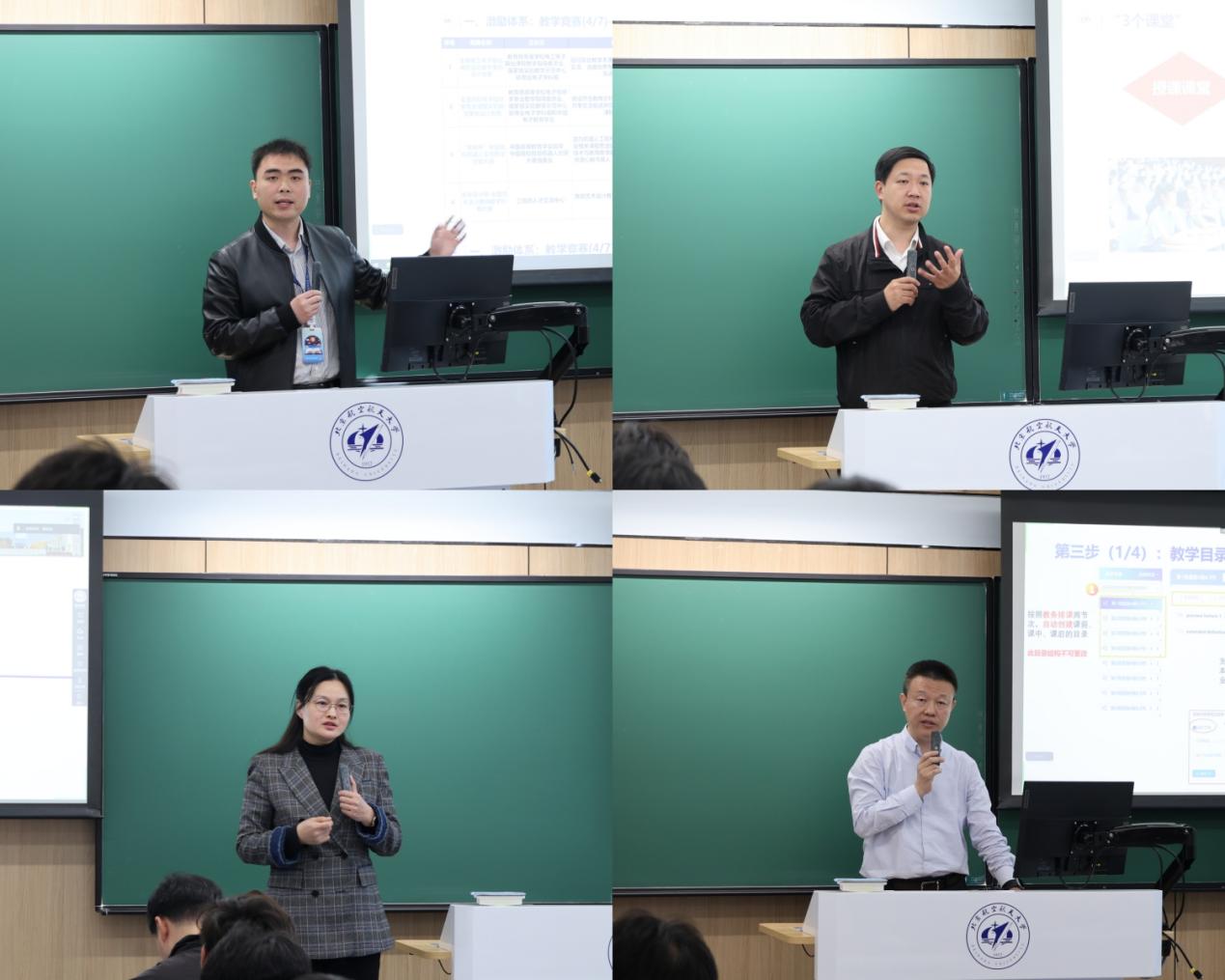 教务部副部长杨明轩、金天、王亚、教学服务中心主任高翔分别就“北航本科教学相关规定及要求”进行了专题讲座。杨明轩首先从教师教学激励体系和教师教学支持体系两方面进行了详细介绍,随后讲解了课程教材相关规定及要求。金天围绕实验实践教学相关要求、教学研究建设未来方向、教学改革项目、教学成果奖等方面详解实践育人相关规范。王亚从质量底线、质量基线两方面详细解读了教学质量相关规定及要求。高翔着重强调了教学管理制度的严肃性,并详细介绍了教育教学软硬件建设及智学北航应用的相关情况。