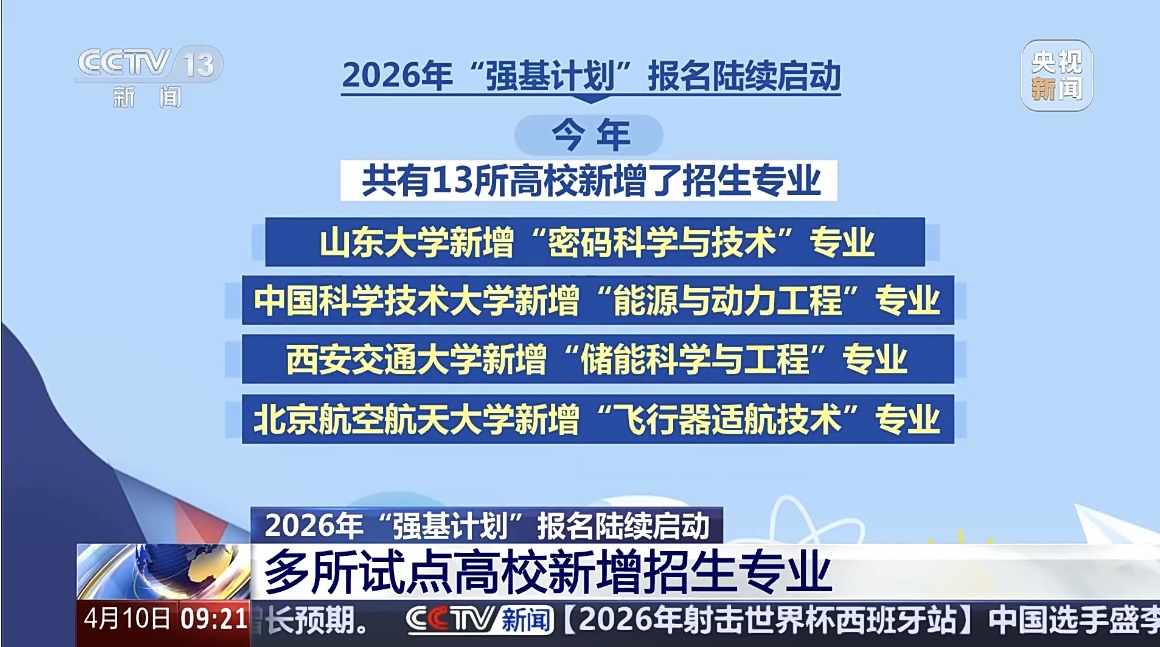 【解说】目前,强基计划试点高校共39所,在数学、物理、化学、生物、力学、历史、哲学、古文字学、基础医学等基础学科,以及国家重大战略领域相关专业招生。今年共有13所高校新增了招生专业,其中山东大学新增密码科学与技术专业,中国科学技术大学新增能源与动力工程专业,西安交通大学新增储能科学与工程专业,北京航空航天大学新增飞行器适航技术专业,天津大学新增船舶与海洋工程专业。