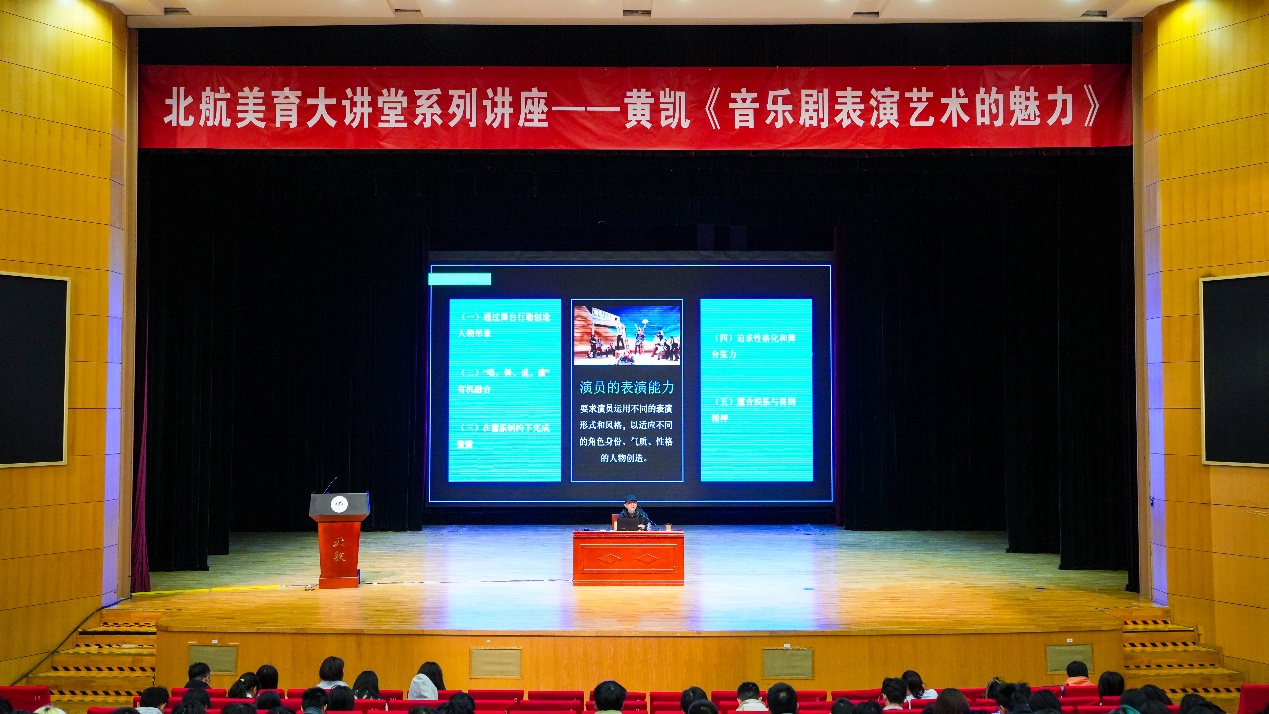 北航新闻网4月11日电(通讯员 高蕊)4月8日下午,北航美育中心特邀北京舞蹈学院音乐剧系主任、一级导演、中国戏剧金狮奖导演奖获得者黄凯做客美育大讲堂,为师生带来题为“音乐剧表演艺术的魅力”美育主题讲座。讲座由美育中心副主任宋泽惠主持。