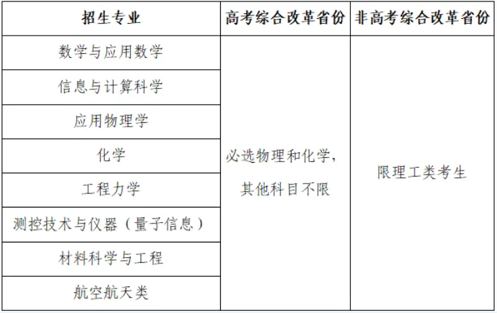 我校围绕数学与应用数学、信息与计算科学、应用物理学、化学、工程力学、测控技术与仪器(量子信息)、材料科学与工程、航空航天类等专业设置2026年强基计划招生专业及对应培养方向。符合报名条件的考生在各省(区、市)可填报的招生专业和招生计划以我校强基计划报名系统公布为准。