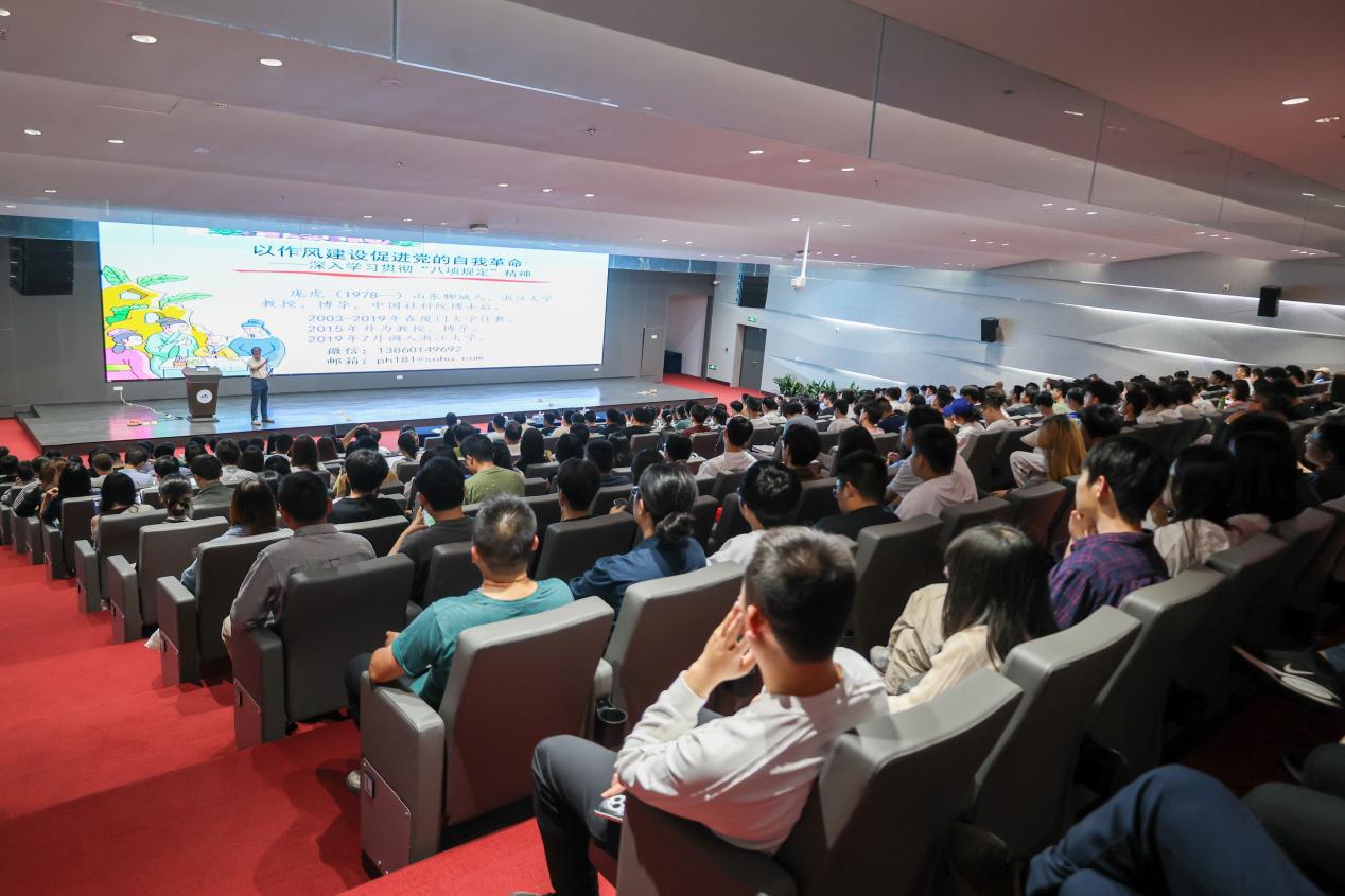 北航新闻网5月9日电(通讯员 沈慧/文 袁晓慧/摄影)5月7日下午,深入贯彻中央八项规定精神学习教育专家辅导报告会在北航杭州国际校园会议中心召开,浙江大学马克思主义学院庞虎教授受邀作《以作风建设促进党的自我革命——深入学习贯彻“中央八项规定”精神》专题报告。杭州国际创新研究院(国际创新学院)党委理论学习中心组成员、全体师生党员、党校首期入党积极分子培训班学员和杭州国际创新研究院(国际创新学院)“星空”党建联建单位党员干部代表近400人参加学习。