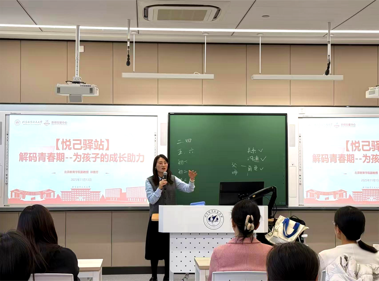 北航新闻网11月18日电(通讯员 朱蕊寒/文 高一丹/摄影)为帮助教职工更好地陪伴子女度过成长关键期,搭建积极健康的亲子沟通桥梁,营造温馨和谐的家庭氛围,教师发展中心特邀北京教育学院副教授林雅芳,为教职工带来“解码青春期——为孩子的成长助力”专题讲座。活动旨在通过专业分享,助力教职工掌握科学的亲子教育理念与实用方法,为孩子的顺利成长提供有力支持。讲座由教师发展中心主任李红捷主持。