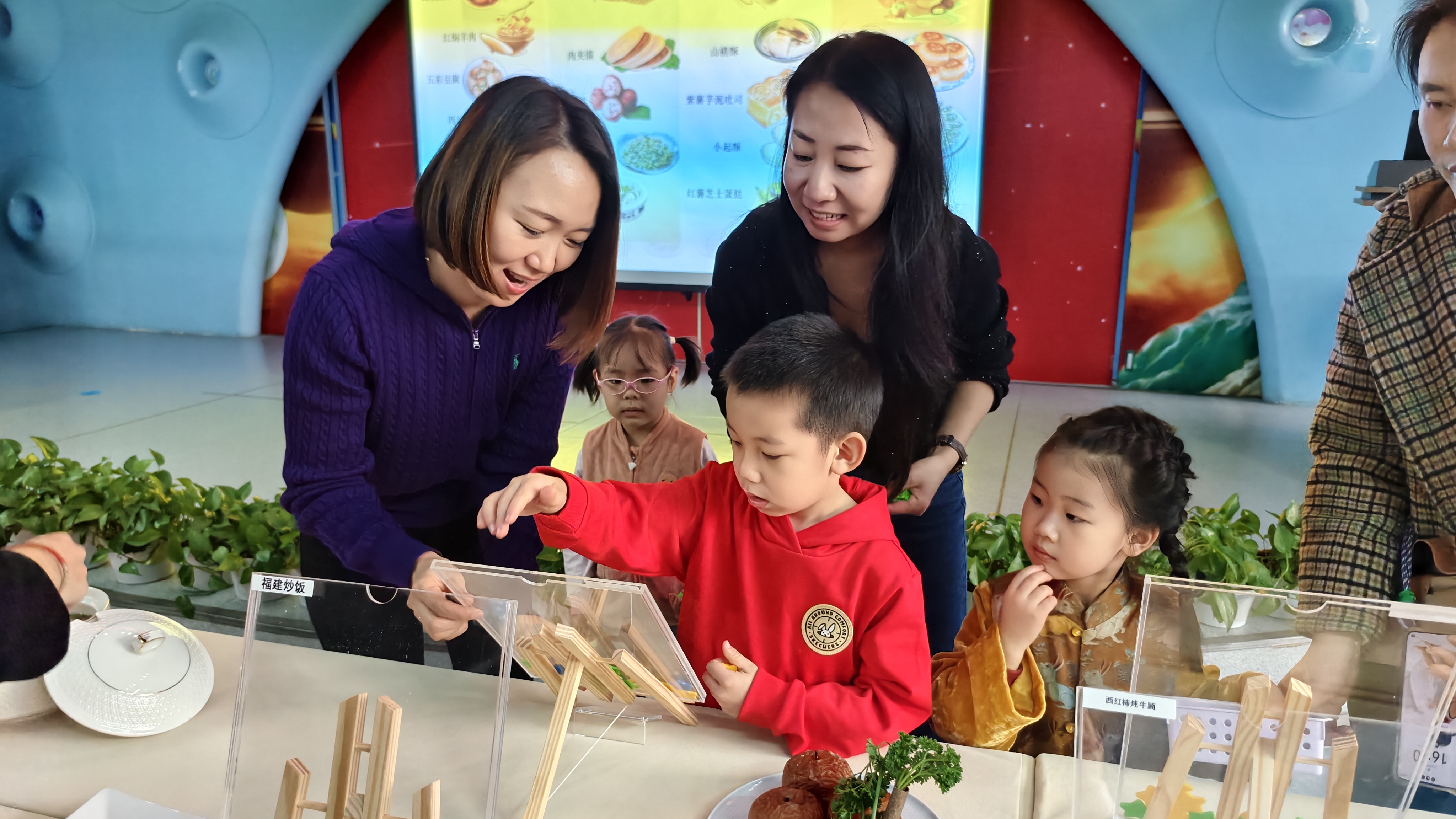 简短介绍后,孩子在家长的带领下有序自主取餐、品鉴。多功能厅内香气四溢、欢声笑语,这场舌尖上的味觉盛宴,既展现了中国饮食文化的多元魅力,更以润物细无声的方式,让孩子们在品味中传承中华饮食文化、拥抱绿色健康。