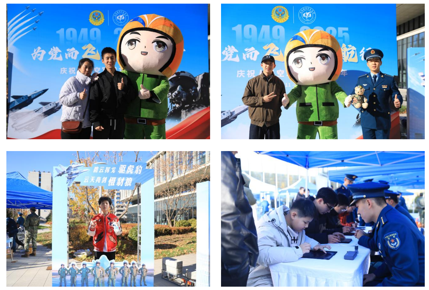 在温馨的合影寄语区,同学们与身着飞行服的卡通人偶合影,并在祝福卡上写下对人民空军的美好祝愿。“人民空军,生日快乐”“翱翔蓝天,守护和平”……一张张卡片贴满祝福墙,凝聚着北航学子对人民空军的崇高敬意与深厚情感。