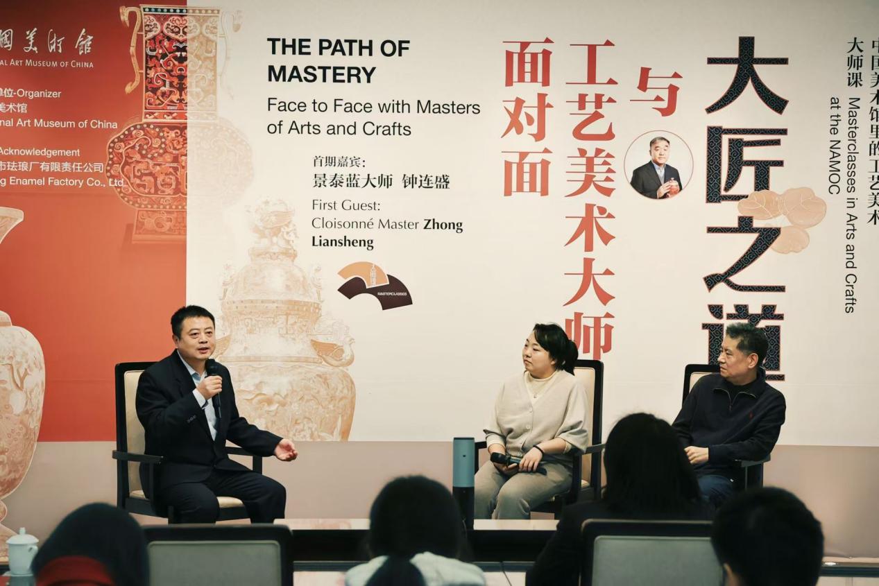 在对话环节,王雪峰与钟连盛及其徒弟、珐琅厂工艺师,就景泰蓝与珐琅、景泰蓝的传承来源以及钱美华对景泰蓝的引领等话题展开深入探讨。