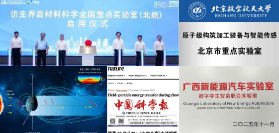 左上一:仿生科学研究中心深度参与建设仿生界面材料科学全国重点实验室;右上一:原子制造中心获批北京市重点实验室;左下一:空间科学科教中心教师Nature一篇;右下一:数字孪生制造联合实验室揭牌