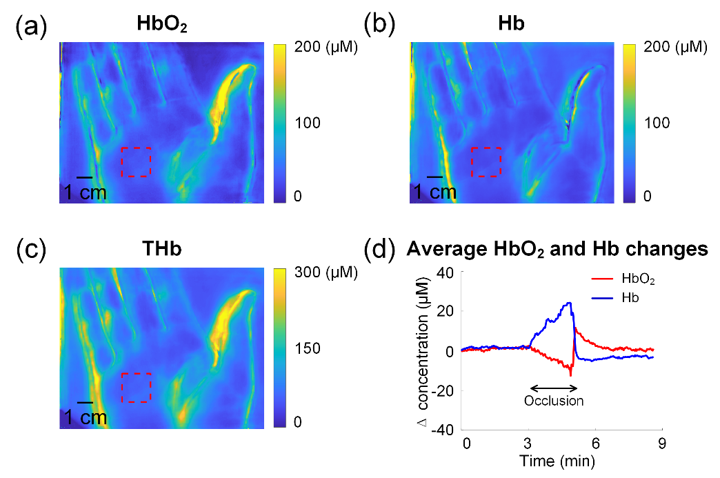 结合比尔-朗伯定律,研究人员进一步展示了袖带闭塞实验中的人体血供实时监测,通过快照式高精度定量成像,实现了组织氧合血红蛋白、脱氧血红蛋白的高速定量成像(图6)。
