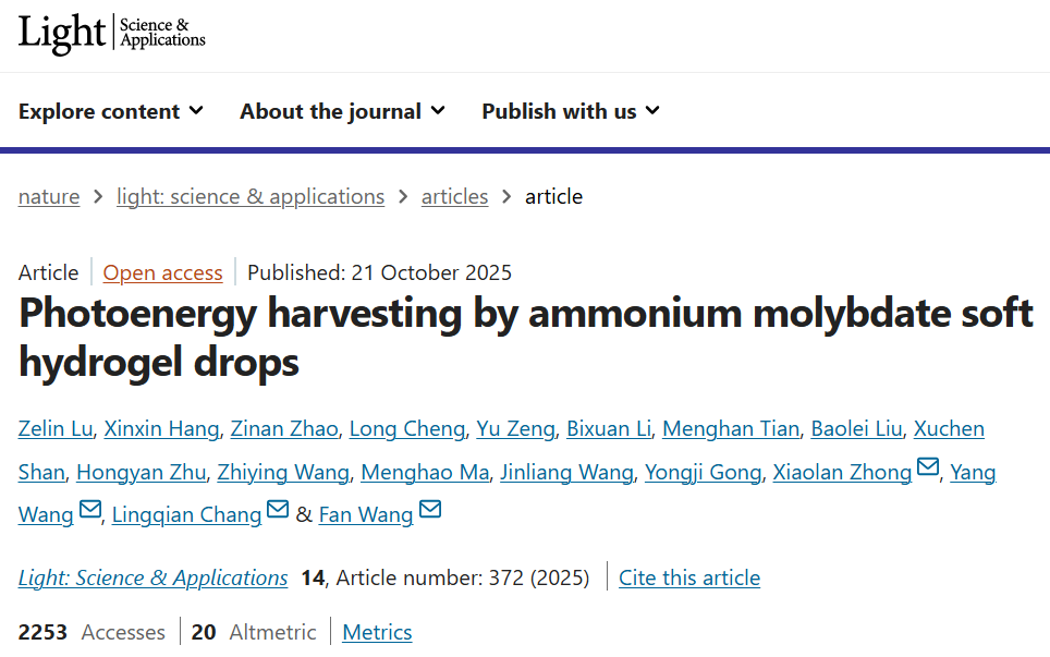 北航新闻网11月18日电(通讯员 王琳)近日,北航物理学院纳米光子学实验室的王帆教授与钟晓岚教授科研团队,在基于电子-离子调控的能量转化领域取得重要进展,相关研究成果以“Photoenergy harvesting by ammonium molybdate soft hydrogel drops”为题,发表于《Light: Science & Applications》上。物理学院博士生卢泽霖为该论文的第一作者,钟晓岚教授、王帆教授以及生物与医学工程学院的王杨副教授、常凌乾教授为该论文的通讯作者。