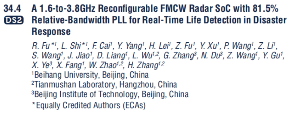 张慧、伍连博团队发表的论文名为《A 1.6-to-3.8GHz Reconfigurable FMCW Radar Soc with 81.5% Relative-Bandwidth PLL for Real-Time Life Detection in Disaster Response》,具备1.6GHz至3.8GHz宽频自适应可调节能力,搭载高带宽锁相环,可实现穿透多种障碍物下的多目标运动轨迹跟踪与呼吸体征检测功能。这项技术首次在ISSCC上亮相,未来可在灾后救援、医疗监护、反恐行动等领域发挥重要作用,为复杂环境下的生命探测提供高精度、实时化的芯片级解决方案。论文被安排在Session 34进行报告,并将在Demo Session中进行实物展示。