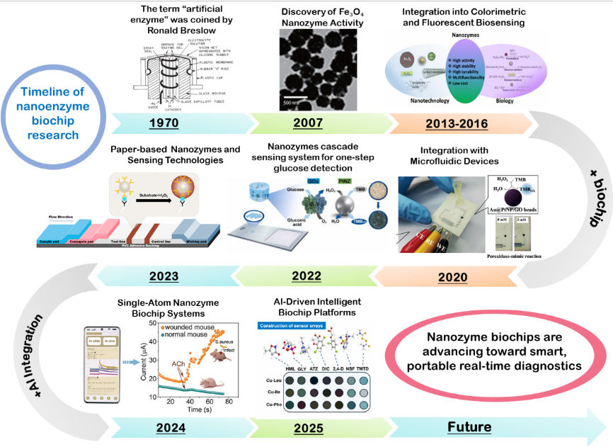 图2.纳米酶-生物芯片研究与系统演进时间轴:从单一体系走向AI集成的智能生物传感平台。