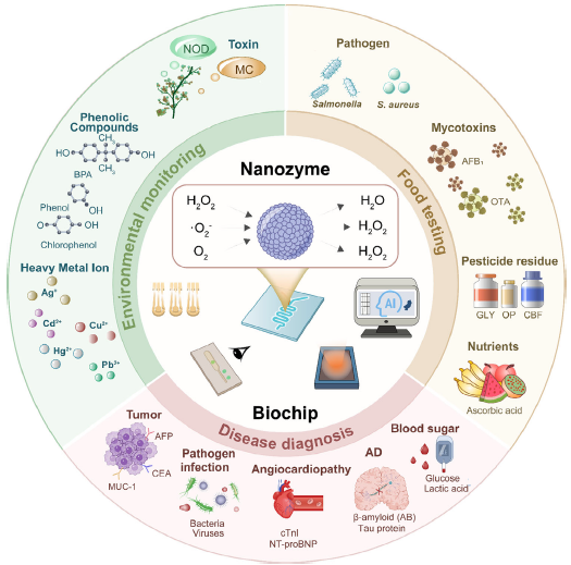 图1.纳米酶-生物芯片系统及其在疾病诊断、食品检测与环境监测中的代表性应用概览。