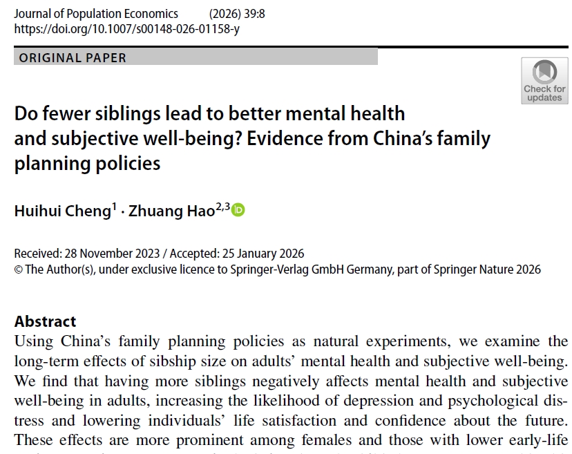该研究使用我国两项计划生育政策作为自然试验,运用2010-2018年中国家庭追踪调查(China Family Panel Studies)数据,首次检验了兄弟姐妹数量对成年人精神健康和主观福利的长期影响。研究发现,成人个体拥有越多兄弟姐妹,其精神健康和主观幸福感越差,表现为增加其抑郁的可能性、降低生活满意度与降低对未来的信心。这一影响主要集中在女性和经济社会地位较低的家庭。这些证据表明,家庭规模对精神健康的影响也满足经典的“数量-质量”权衡理论。然而,研究还发现,独生子女相比于非独生子女也拥有更差的精神健康和主观幸福感,这与“独生子女劣势”理论的预测一致。论文在机制研究中发现证据表明独生子女由于缺少兄弟姐妹的互动与支持在社交技巧和人格特质方面存在劣势,而这些因素对精神健康的负面影响可能超过了独生子女从“数量-质量”权衡中获得的优势。上述发现调和了“数量-质量”权衡理论与“独生子女劣势”理论这两大竞争性理论,推进了家庭规模与精神健康和主观幸福感的研究与理解。在政策意义上,为我国生育政策改革提供了精神健康方面的新的证据。