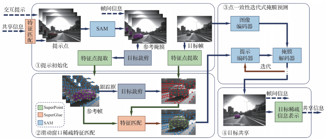 不同于传统的依赖密集特征图或掩膜传播的思路,本文采用一种更轻量、更通用的信息表示——稀疏特征点。整体框架如图1所示,首先通过提示点引导任意分割模型(Segment Anything Model,SAM)分割出初始帧中的未知目标;随后利用SuperPoint特征点检测网络提取目标区域的稀疏特征点,并通过SuperGlue匹配网络在后续帧中跟踪这些特征点,从而实现目标信息的跨帧传递。相比于依赖密集特征的方法,这种基于稀疏特征点的表示与匹配机制具有显著优势:一方面,其特征提取与匹配过程仅关注图像中的关键局部结构,避免了冗余计算,提升了算法效率;另一方面,特征的稀疏性使得目标表示的数据量大幅减少,为通信带宽受限的协同感知场景提供了实用解决方案,为多智能体协同跟踪提供了可能。