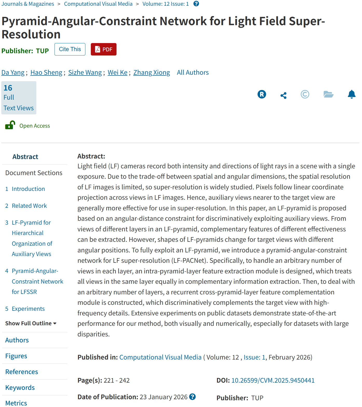 北航新闻网3月15日电(通讯员 袁晓慧)近日,北航国新院数据科学与智能计算科教平台团队的研究论文Pyramid-Angular-Constraint Network for Light Field Super-Resolution,正式发表于国际知名期刊CVMJ,标志着团队在全域场景中光场的结构化建模与鲁棒语义理解方向取得了阶段性突破。论文第一作者为北航国新院博士后杨达,通讯作者为北航计算机学院/国新院数据科学与智能计算科教平台盛浩教授。