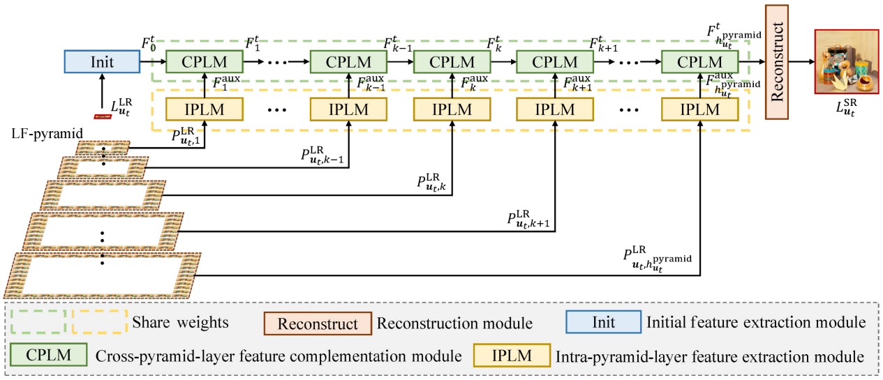 光场相机能够在单次曝光中同时记录场景中光线的强度和传播方向,然而,由于空间维度与角域维度间的平衡关系,光场图像的空间分辨率受到限制,因此,超分辨成为光场图像处理中的关键环节。光场图像中像素在子孔径图像(Sub-aperture Image,SAI)间遵循线性坐标映射关系,因此,在超分辨光场任意目标SAI时,随着辅助SAI与目标SAI间角域距离的增大,从辅助SAI中提取的补充信息有效性逐渐降低。团队基于角域距离约束提出了一种新型光场图像组织结构——光场金字塔LF-pyramid,根据辅助SAI在目标SAI超分辨任务中的有效性分组利用,从而显著降低有效补充信息的提取难度,提升超分辨表现。据此,团队进一步提出了用于光场图像超分辨的金字塔角域约束网络LF-PACNet,基于LF-pyramid视角图像层级,高效提取有效性互补的特征。