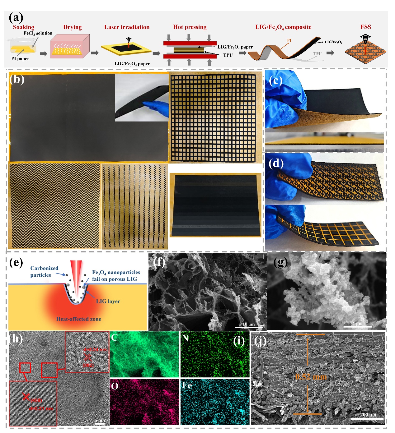 图1 LIG/Fe3O4复合材料的制备流程、宏观定制化设计展示及微观多尺度形貌与结构表征