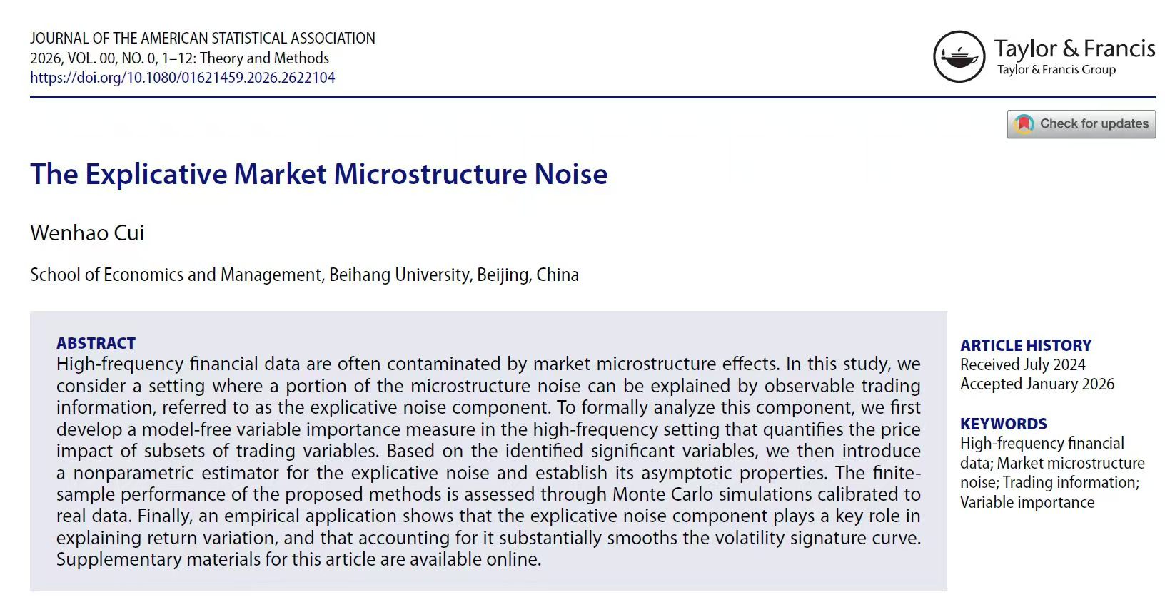 北航新闻网4月17日电(通讯员 艾梦囡)近日,经济管理学院崔文昊老师在国际知名统计学期刊《Journal of the American Statistical Association》(JASA)上发表题为《The Explicable Market Microstructure Noise》(可解释市场微观结构噪声)的研究论文。该期刊作为美国统计学会的会刊,涵盖统计理论、方法及应用等多个方向,长期以来享有较高的学术影响力。