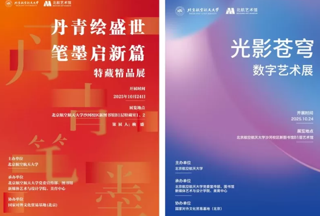 10月24日,北京航空航天大学(沙河校区)艺术馆正式开馆,艺术馆开馆仪式暨主题展览开幕式在沙河校区新图书馆第一报告厅举行。此次开馆同期推出了两个展览:“丹青绘盛世·笔墨启新篇:特藏精品展”与“光影苍穹:数字艺术展”。