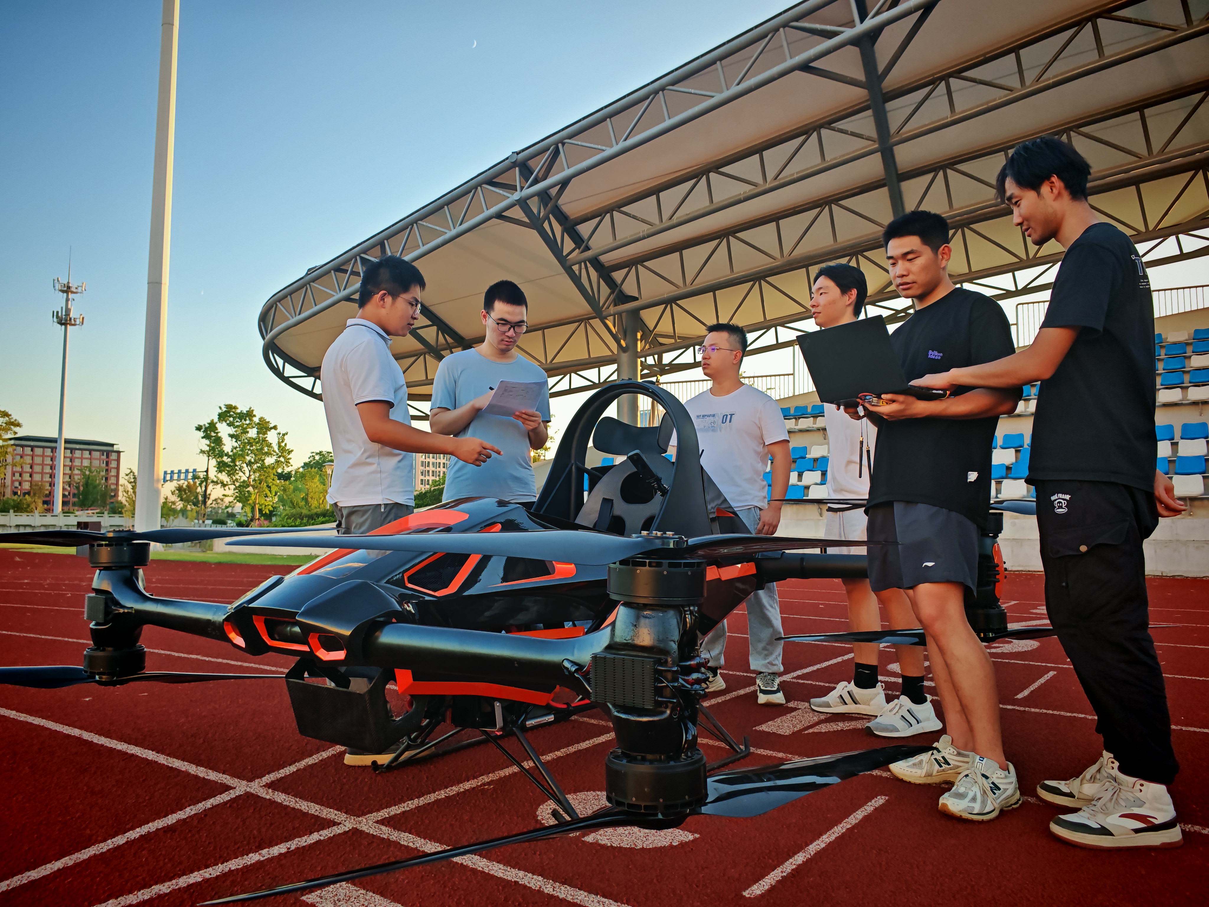 研究生作为总师研制的低空超轻型飞行器,在大学操场调试试验。学校供图