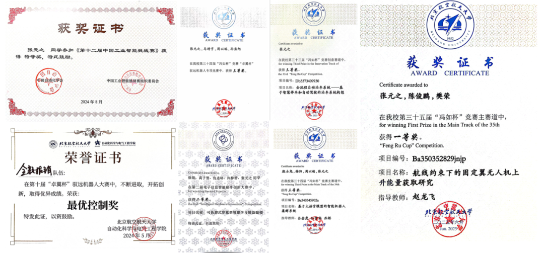 在导师指导下,他主持的课题获评国家级大创项目。作为项目负责人,他带领团队攻克难题,最终以第一作者身份荣获第35届“冯如杯”主赛道制作组一等奖。此外,他还代表北航出征第十二届中国工业智能挑战赛,与全国120余支顶尖队伍同台竞技,斩获国家级特等奖。