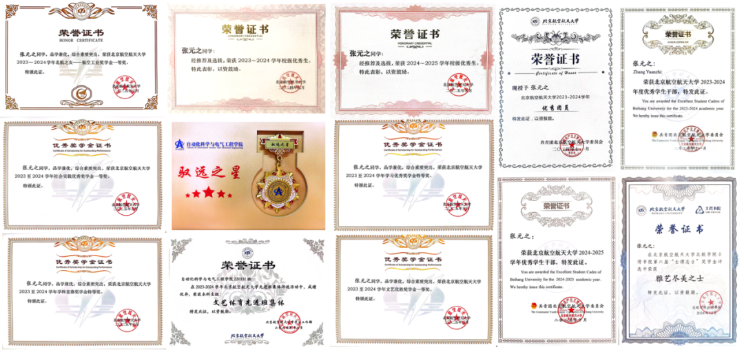 作为北航自动化学院首批“拔尖计划”学生,张元之以综合成绩年级第一、GPA和平均分专业第一的成绩,展现了自动化人在学业上的精准把控。他所修的课程中,25门课程分数95+、55门课程分数90+、6门课程满分,连续三年获评校级优秀生,荣获国家奖学金等11项荣誉。