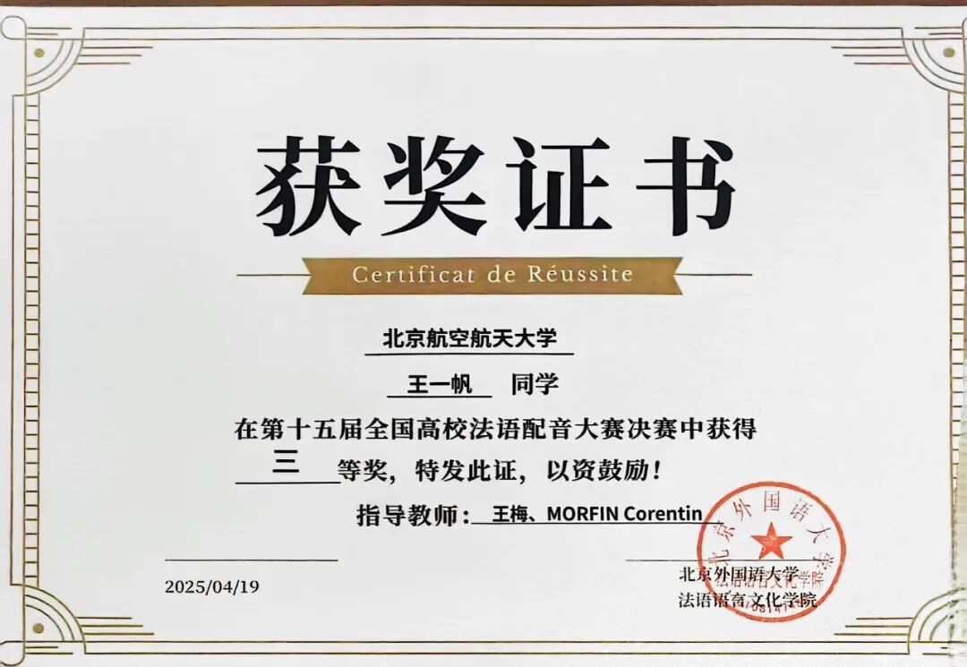 王一帆在法语配音大赛中获奖