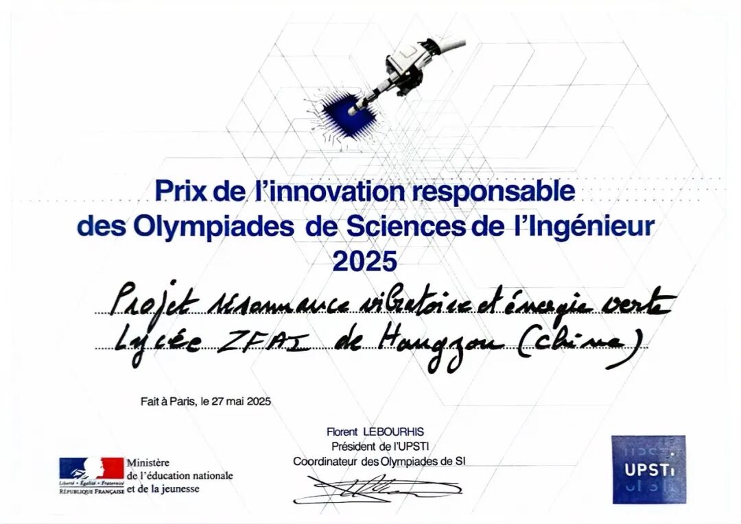 王一帆所在团队在第十六届法国工业科学奥林匹亚科技竞赛中获奖