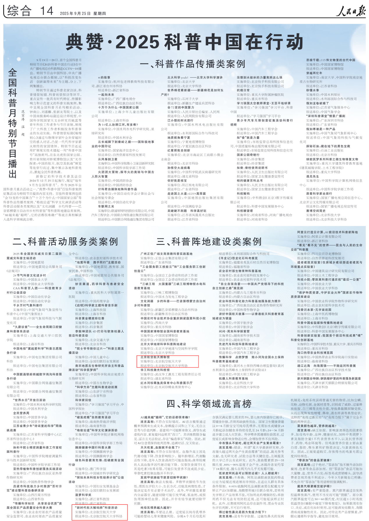 北航新闻网10月27日电(通讯员 鲜宁)近日,由中国科学技术协会(以下简称“中国科协”)主办的“典赞·科普中国”百佳科普案例评选结果在人民日报发布。经北航科协推荐,“北京航空航天博物馆”和“新时代航天解码师”分别入选“科普阵地建设类”及“科普活动服务类”典型案例。