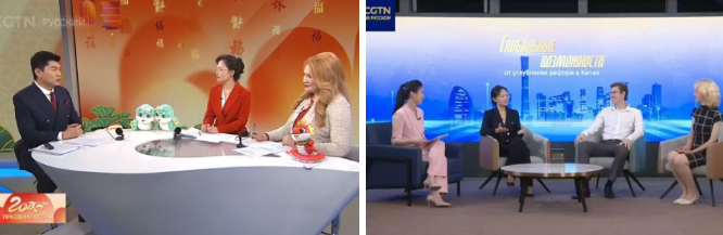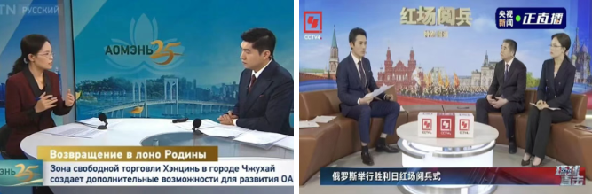 左图:2024年,澳门回归25周年直播特别节目在CGTN俄语频道播出,王悦作为特邀嘉宾参与直播 右图:2023年,王悦参加央视直播俄罗斯纪念卫国战争胜利78周年红场阅兵特别节目