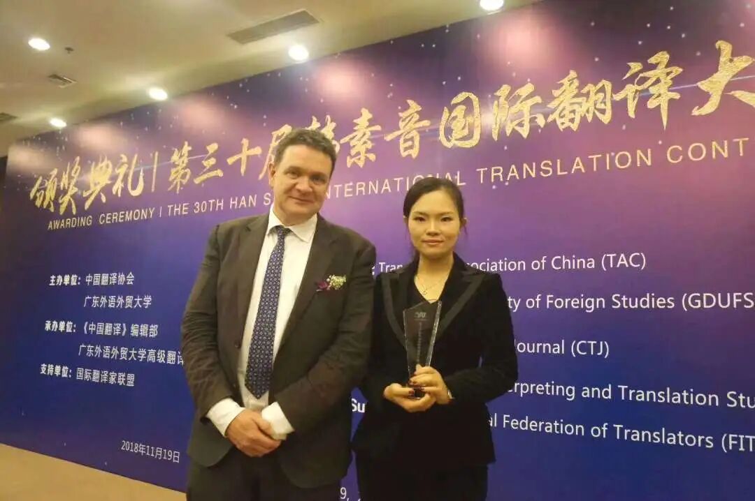 2018年,王悦老师荣获第三十届韩素音国际翻译大赛汉译俄组一等奖