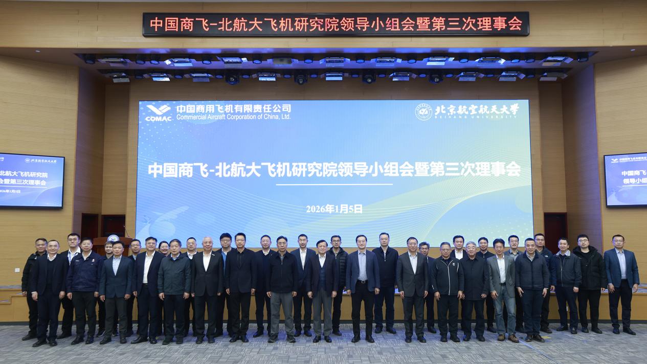 北航新闻网1月8日电(通讯员 靳海川 李灿)1月5日下午,北京航空航天大学与中国商飞联合召开中国商飞—北航大飞机研究院领导小组会暨第三次理事会,会议在中国商飞北京民用飞机技术研究中心举行。北航校长王云鹏,副校长吕金虎;中国商飞公司党委书记、董事长贺东风,党委副书记、总经理沈波,副总经理吴文生出席会议。中国工程院院士、中国商飞首席科学家吴光辉,中国工程院院士、C909系列总设计师陈勇,中国工程院院士王华明,中国科学院院士王晋军,美国工程院院士周明等专家参加会议。会议由吴文生主持。