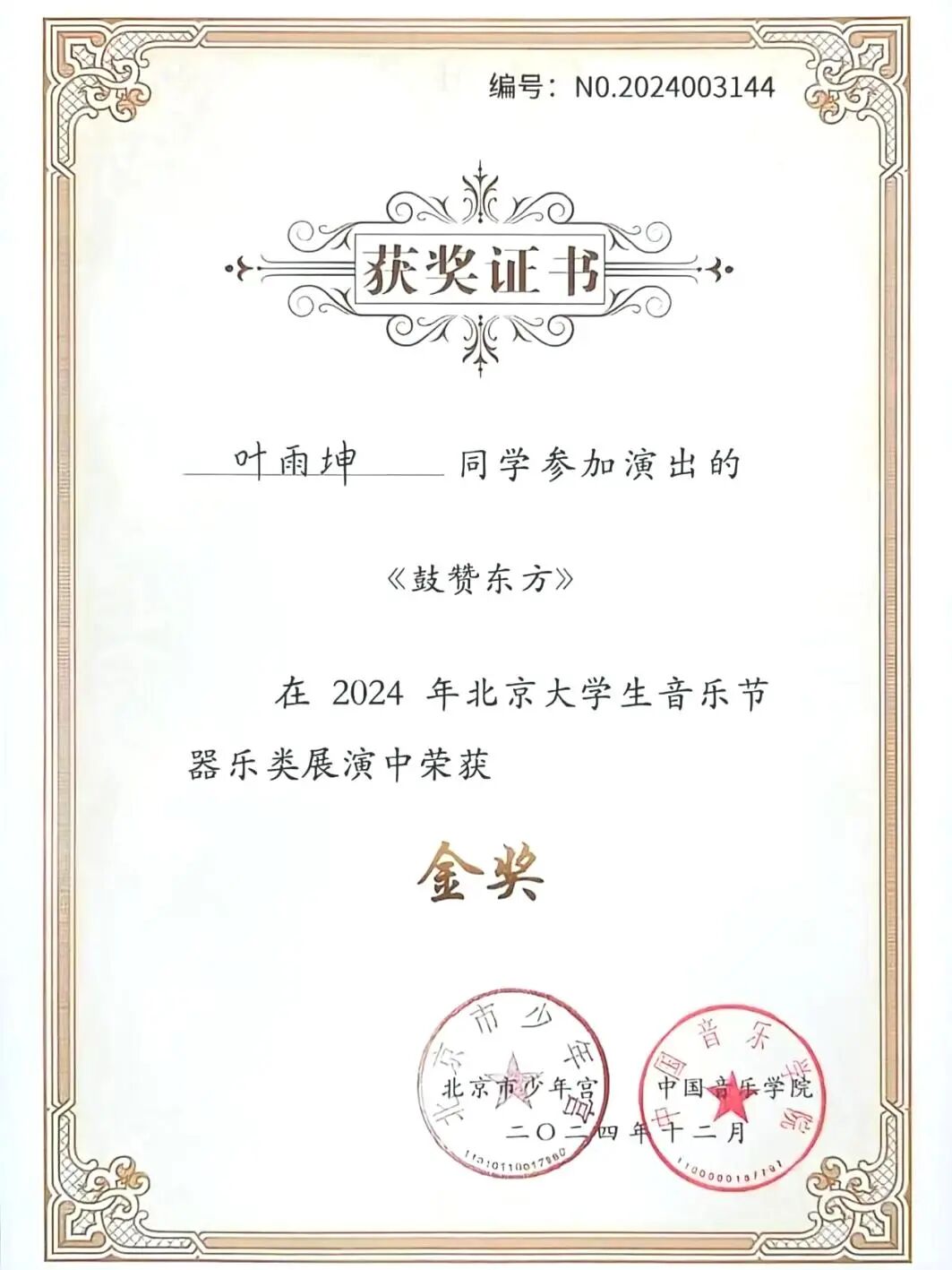 作为校民乐团成员,叶雨坤深度参与打击乐作品《鼓赞东方》的创作与演出,作品获得2024年北京市大学生音乐节金奖,还登上北京卫视《2025科学跨年之夜》舞台。