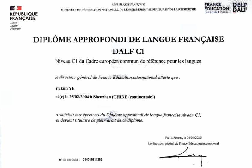 叶雨坤获得DALF C1高级法语文凭