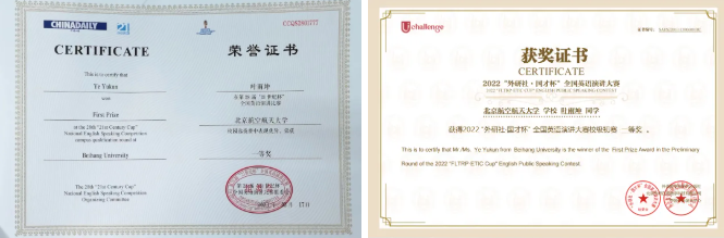 “语言不只是工具,更是连接世界的纽带。”初入中法工程师学院,叶雨坤便开启高强度语言攻坚,课堂内紧跟节奏,课堂外主动突破,凭借扎实的英语功底,他一举拿下2023年全国大学生英语竞赛特等奖、“21世纪杯”全国英语演讲比赛北航校园赛一等奖。